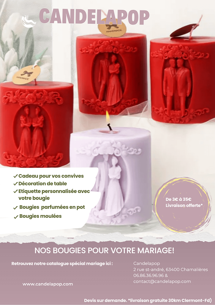 Candelapop vous propose des bougies uniques et originales pour sublimer le jour J. Que ce soit pour vos invités ou pour des décorations personnalisées, chaque bougie est conçue avec soin et créativité, ajoutant une touche chaleureuse et mémorable à votre mariage.